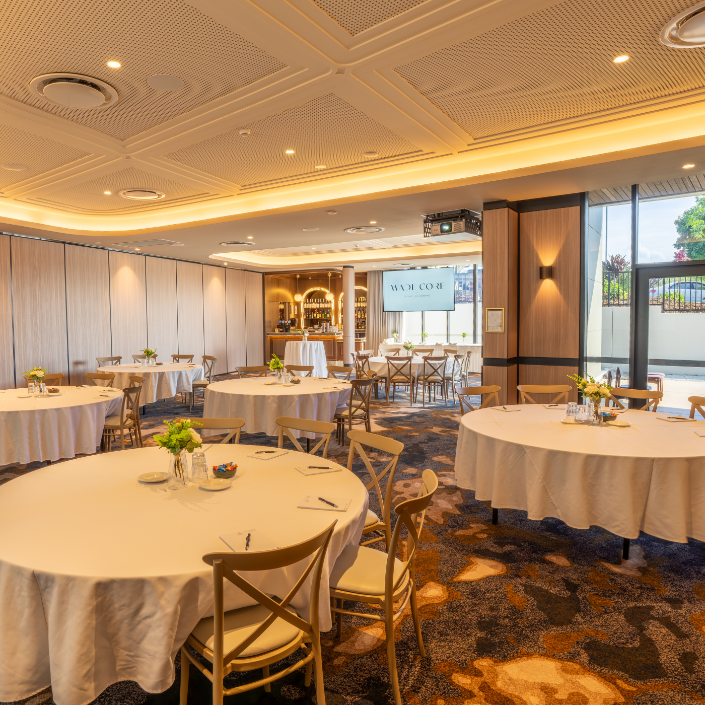 The Wade Core Function Centre can hold 220 seated and 300 standing guests. For smaller events, the room can be divided in two allowing for:
